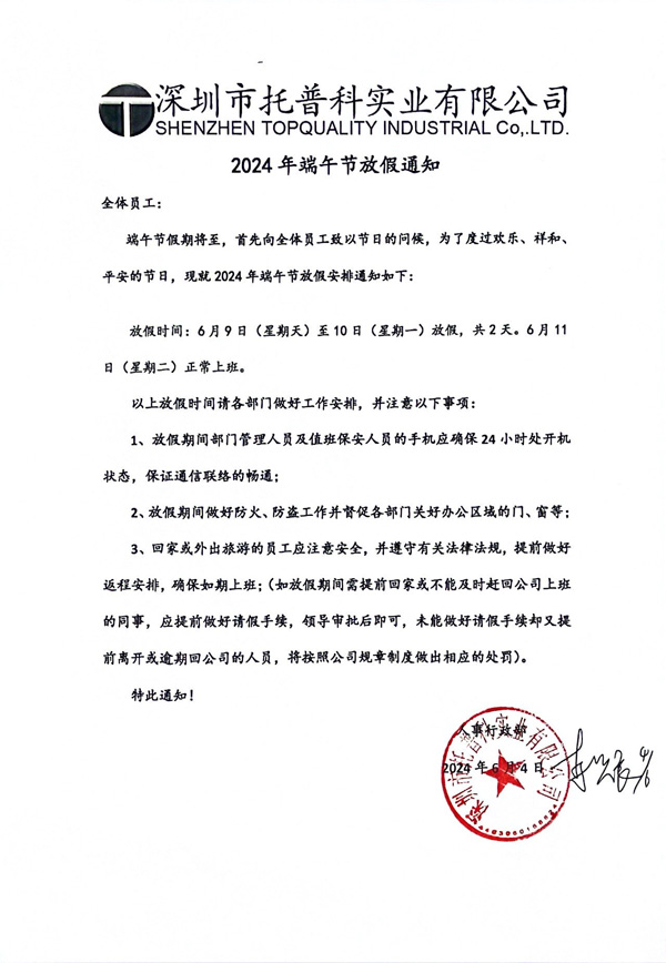 端午節(jié)假期將至,首先向全體員工致以節(jié)日的問候,為了度過歡樂、祥和、平安的節(jié)日,現(xiàn)就 2024年端午節(jié)放假安排通知如下:放假時間:6月9日(星期天)至10日(星期一)放假,共2天。6月11日(星期二)正常上班。