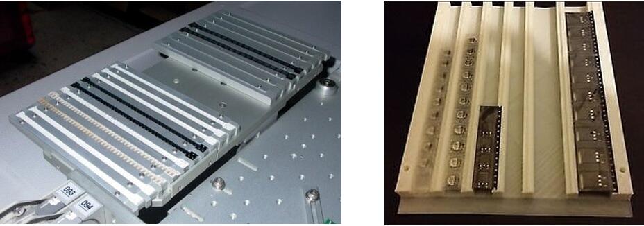 大多數(shù)PCB是由相當堅硬的1.6mm FR4材料制成的,但是當使用較薄的材料或有槽縫時,PCB的支撐將是一個挑戰(zhàn)。 在組件放置過程中,這可能導(dǎo)致不一致的結(jié)果,因為始終會有一定數(shù)量的放置壓力-如果未完全支撐PCB,則它將發(fā)生撓曲。 設(shè)置支持可能很耗時,因此可以在此處看到許多可用的自適應(yīng)系統(tǒng)。 靈活的支撐系統(tǒng)不僅可以快速設(shè)置,而且如果要在已將組件安裝到下側(cè)的情況下構(gòu)建雙面組件時,它們也要考慮在內(nèi)。 在下面可以看到兩個最常見的解決方案,它們將自身模制在已放置的組件周圍
