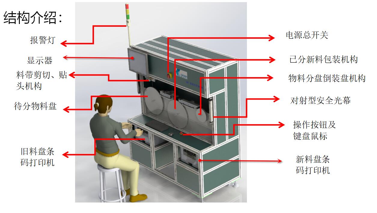 簡介: .通過料盤掃碼自動連接 MES 系統(tǒng),核對并確定分料數(shù)量 .自動精確計數(shù)分盤 ,實(shí)現(xiàn)大盤料分小盤料,整數(shù)盤分定數(shù)盤 .自動包裝,減少人員依賴程度,減輕企業(yè)用工負(fù)擔(dān)。 .自動生成新條形碼打印張貼,便于識別與追溯,提高管理效率